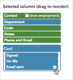 - Contact (choosing this will display their first and last name in a single column. Checking “show employments” will add their full employment details to that column, too — for this example, we’ll leave that unchecked)