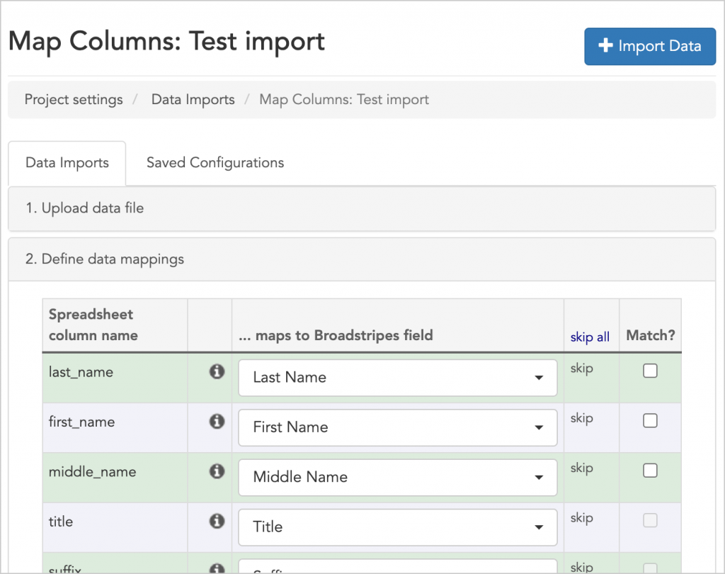 - In the panel below, you’ll see that Broadstripes has recognized some of your spreadsheet columns and automatically “mapped” them to the appropriate fields. Automatic mapping is based on the name of the column (the text in the first row of the spreadsheet).