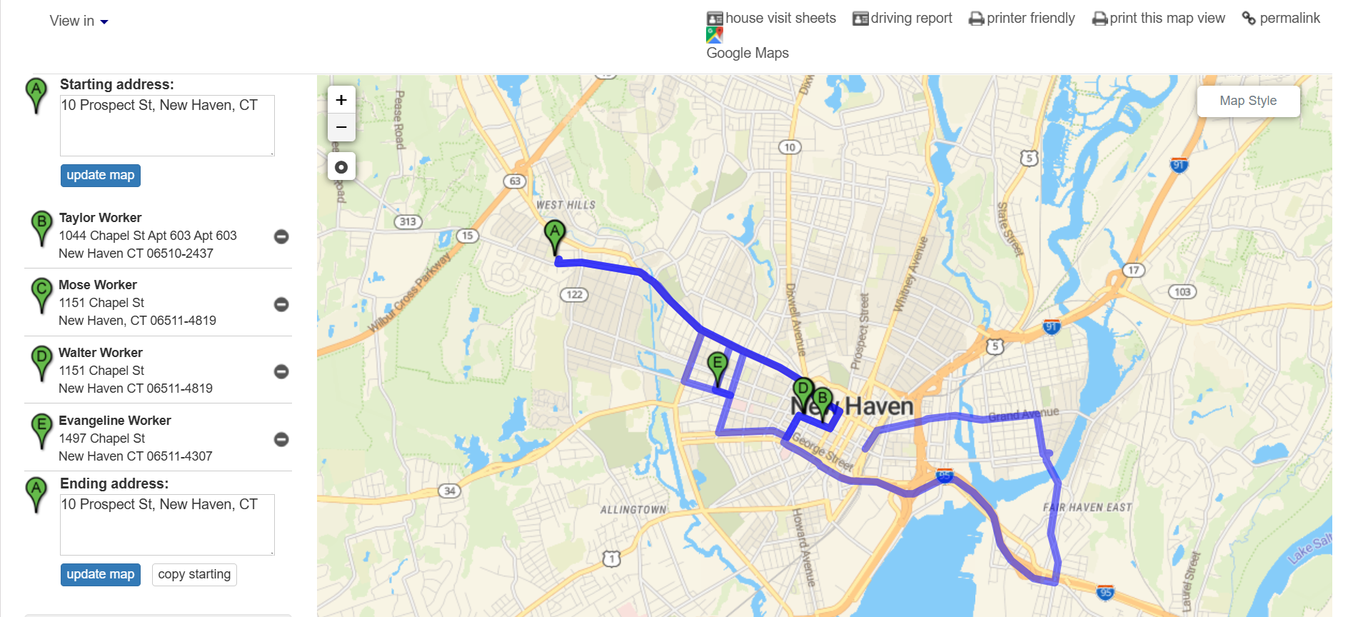 - You can add your starting address in the text box in the upper-left to generate full driving instructions from your current location, then click update map. You may also indicate your ending address in the text box in the lower-left.