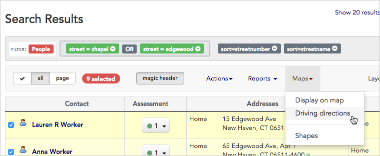 - For this example, we used the advanced search to show us any contacts who live on Chapel Street or Edgewood Avenue, two streets we plan to visit for our campaign. (Learn more about creating custom searches like this in the Create and save a search article).