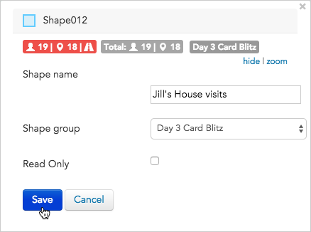 - As shown in the image below, for this example, we’ve changed the name of our shape from “Shape012” to “Jill’s House visits” and chosen to include the shape in the “Day 3 Card Blitz” shape group.