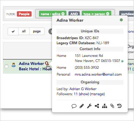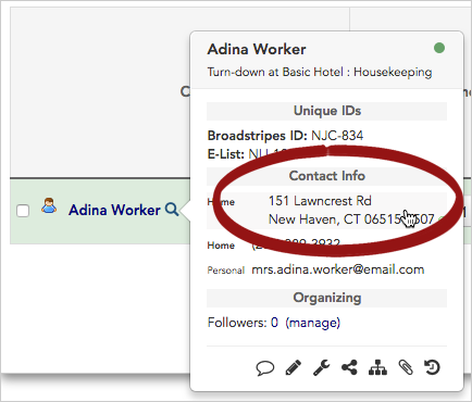 - From the search results panel, hover over the worker’s name and click the looking glass icon. You’ll see a pop-up window with some useful details, including their primary address information.