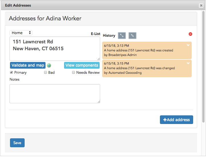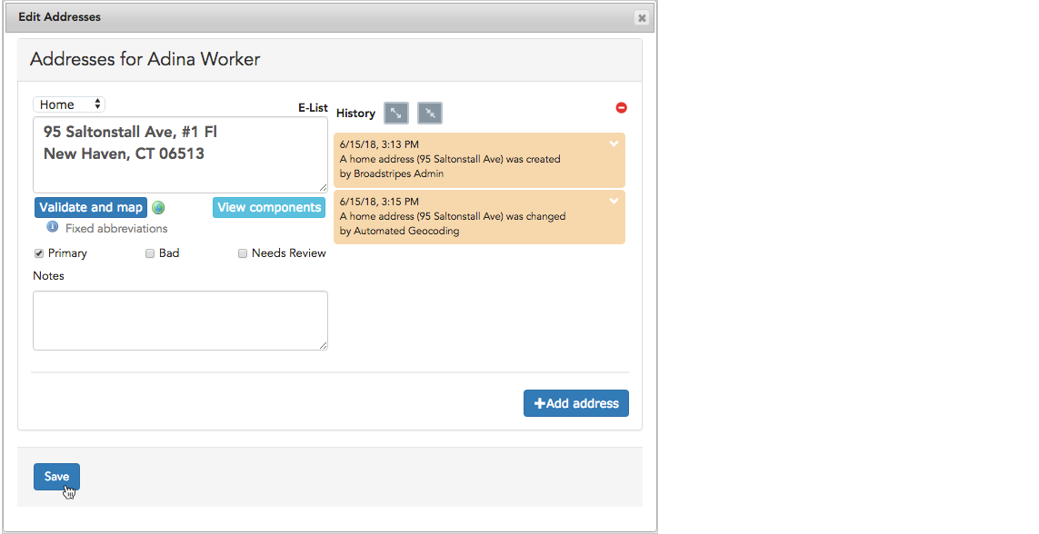 - Check “Primary” if you want to Broadstripes to use this address as the main address for this person (for instance on maps, search result layouts, and exported spreadsheets). Any address previously checked “Primary” will be automatically unchecked. Leave “Primary” unchecked if the new address is a secondary address for this person.